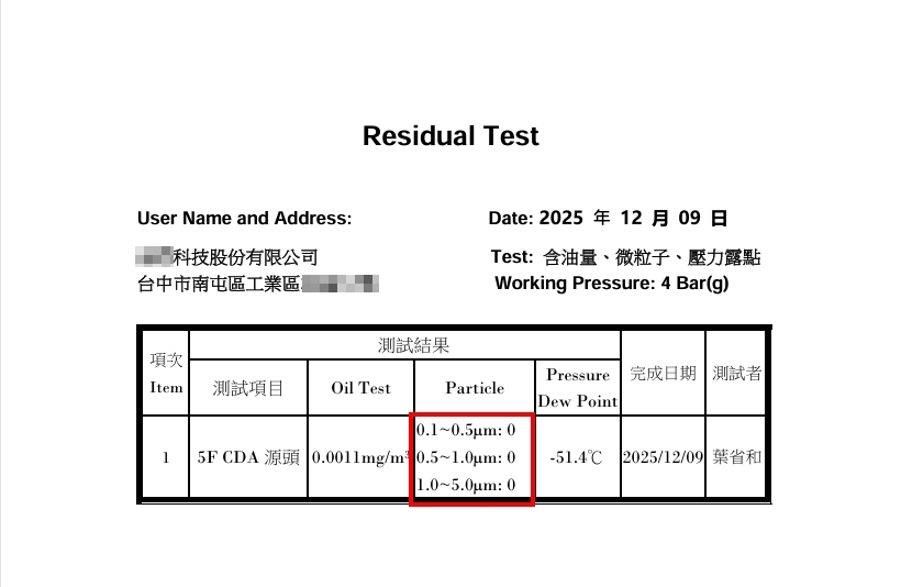 檢測結果顯示,該製程用 CDA 空氣中之 實測含油量為 0.0011 mg/m³,遠低於 ISO 8573-1 Class 1 標準值,整體空氣品質已達 ISO 8573-1 Class 0 等級要求,有效排除含油污染風險,協助客戶恢復製程穩定性並提升產品良率。